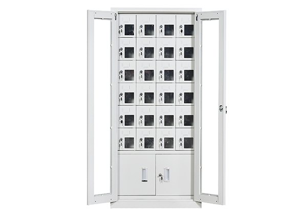 手機保密柜正面為對開金屬邊框玻璃大門,便于觀察柜內(nèi)情況,堅固透亮,美觀大方。